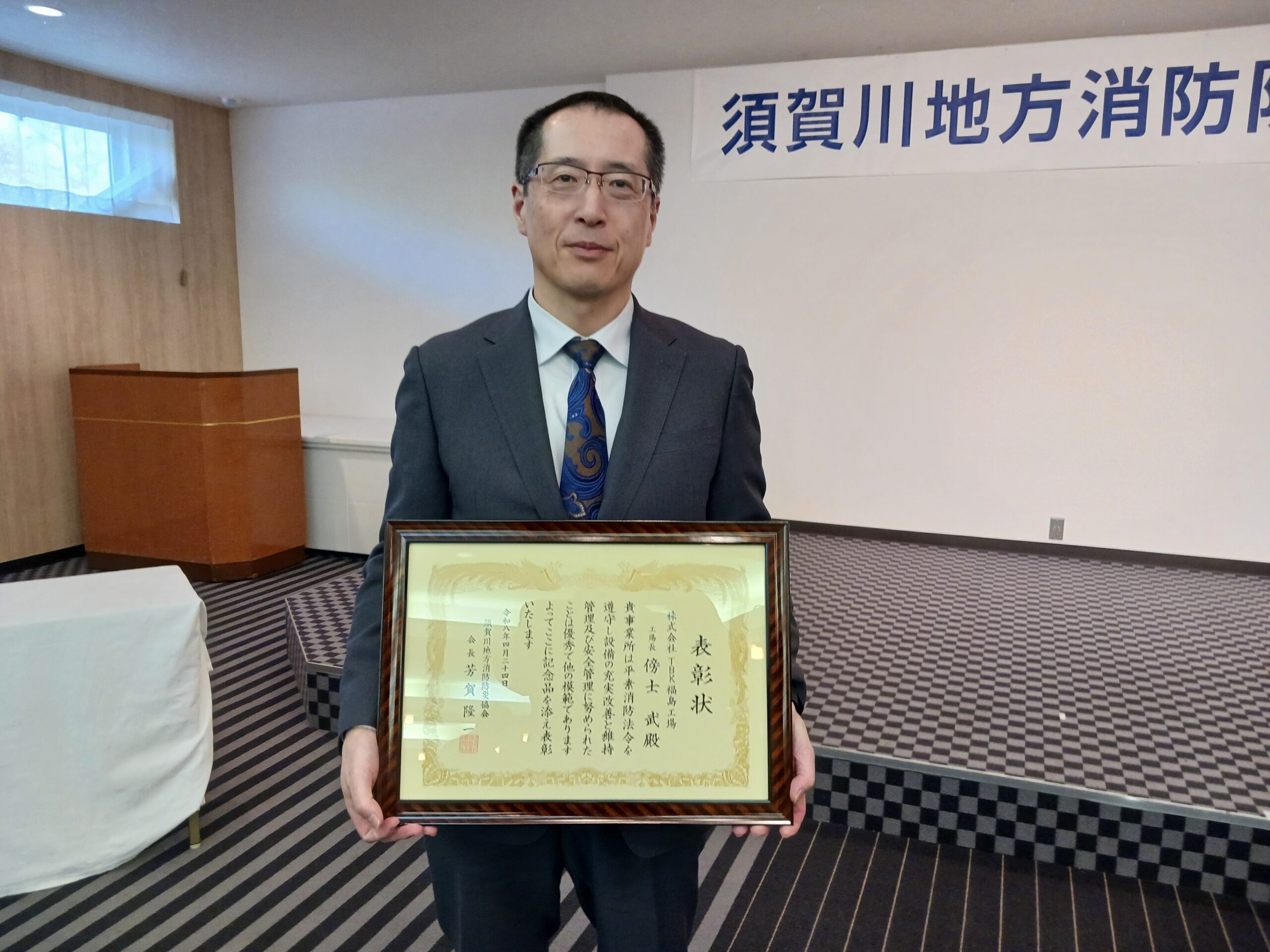 4/24㈮ 須賀川地方消防防災協会による表彰式が開催され、当社福島工場の傍士工場長が出席しました。